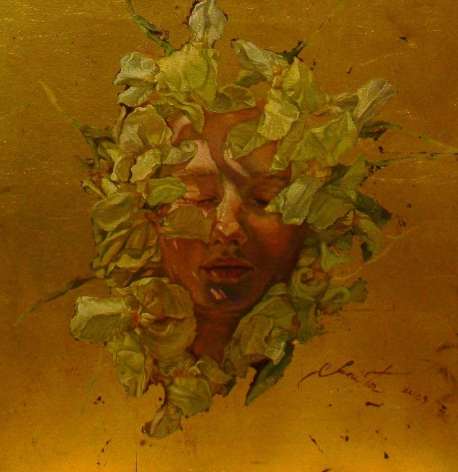 2016.g., attēlā – uz pelēka fona liels pušķis ar baltiem un rozā peoniju ziediem, lejasdaļā zaļas lapas,ziedlapas reljefas, apakšējā kreisajā stūrī paraksts un datējums,audekls, eļļa,64×64(cm),bez rāmja.